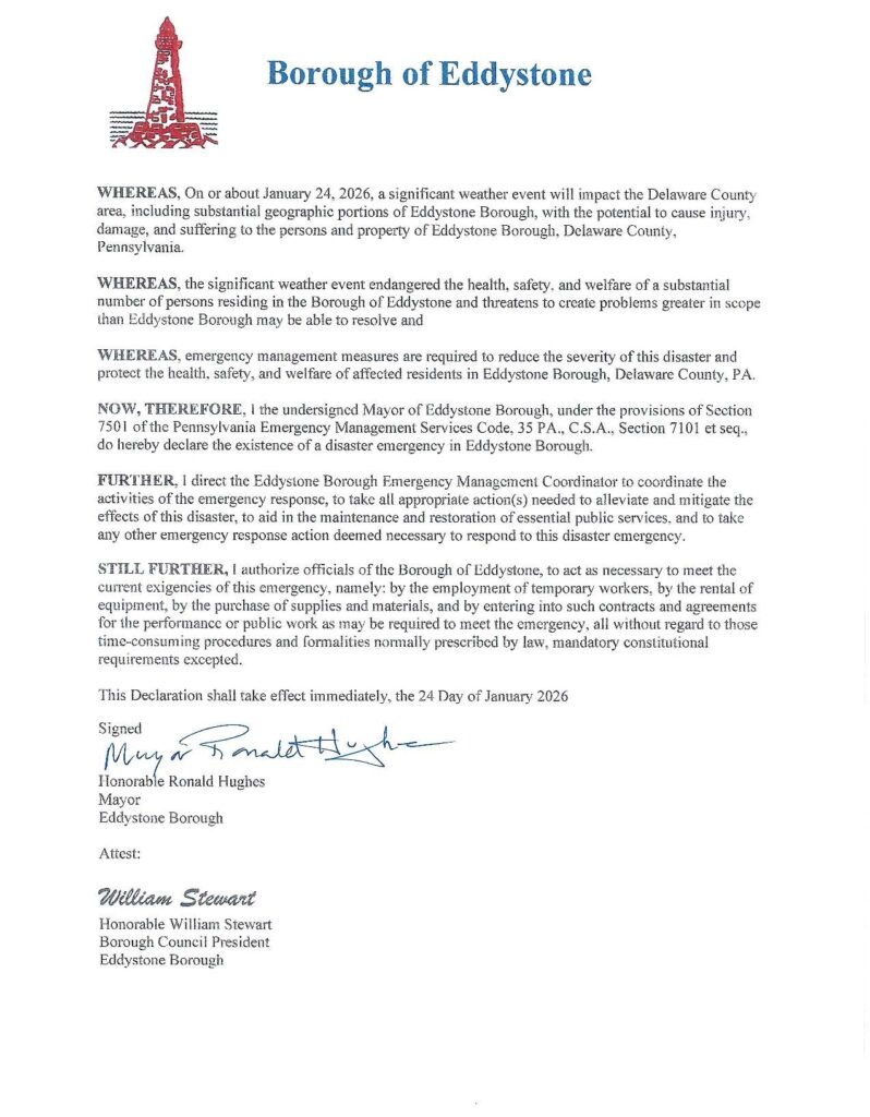 WHEREAS, On or about January 24, 2026, a significant weather event will impact the Delaware County area, including substantial geographic portions of Eddystone Borough, with the potential to cause injury, damage, and suffering to the persons and property of Eddystone Borough, Delaware County, Pennsylvania.